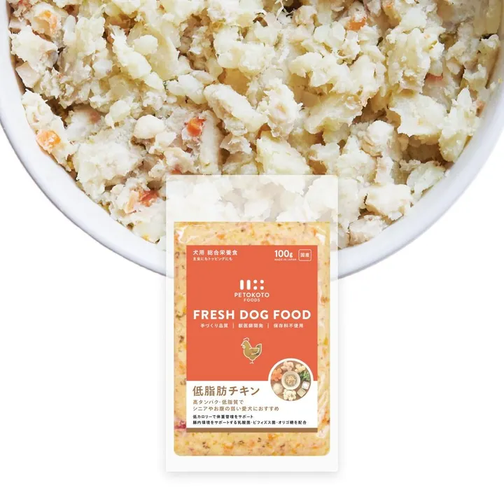 新メニューの低脂肪チキンは、低脂肪で消化器が弱いワンちゃんやシニアのワンちゃんにおすすめです。グルテンフリーのレシピで、良質な国産のささみをメインに、栄養豊富な白米やカリフラワー、れんこん、オクラ、にんじん、フィッシュオイル、亜麻仁オイルなど、10種類以上の自然食材を使用しています。全犬種全年齢で主食でもトッピングでも召し上がっていただける総合栄養食です。全年齢で食べやすいように食材は細かくカットし、スチームで柔らかく混ぜ合わせています。 ・皮膚や被毛の健康をサポートするオメガ3・6脂肪酸を配合 ・アンチエイジングや免疫力をサポートするブロッコリースプラウトを配合 ・腸内環境をサポートするシールド乳酸菌/ビフィズス菌/オリゴ糖を配合 全メニューの中で最も低脂肪のため、胆泥症などの消化器が弱いワンちゃんや、シニアのワンちゃんにおすすめです。 AAFCO基準を満たしています。