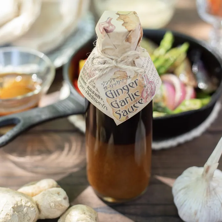 【ヴィーガン】【食品添加物不使用】【砂糖不使用】【生】 ※お知らせ このたび「ジンジャーガーリックソース」のレシピを一部改良しました。 生製法のまま、保存料は使わず、国産米酢をほんの少量加えることで品質をより安定。 そこにさっぱりとまろやかな味わいが加わり、さらに美味しくなりました。 厚揚げや蒸し野菜にそのままかければ絶品。 パスタや野菜炒めなど、毎日のごはんも手軽にグッと引き立てます。 いっそう美味しくなった「ジンジャーガーリックソース」、ぜひいろいろなお料理でお楽しみください。 ✧ 風味豊かな国産にんにくと生姜を生のまますりおろし、こだわりの木桶仕込み天然醸造醤油と、国産純米酒をブレンド。 熱を加えず、酵素が生きたままの美味しい万能調味料に仕上げました。 砂糖不使用で甘くないので、どんなお料理にも使えて、これ1本で美味しく味が決まります。 忙しい時でも美味しくヘルシーな食事をしたいという方、お料理初心者や苦手な方でも、簡単に美味しく味が決まって、何にでも使える、頼もしい調味料です。 「ありそうでない」「一度使ったら手放せない」「無いと困る!」との声、リピーター続出商品です。 ◆こだわり抜いた上質素材◆ 〖しょうが〗 高知県産の香り高いしょうがを使用。無農薬・無肥料で栽培されています。収穫後は土に埋めてじっくり熟成・保存し、美味しさを引き出しています。 〖にんにく〗 島根県産、農薬不使用、肥料は鶏糞と牛糞を使用。 古くから神聖な山として崇められてきた三瓶山の国立公園内の農場で愛情込めて育てられています。 清らかな空気と水がにんにくの味をまろやかにし、冬場の雪は、下に眠るにんにくを密度濃く甘く仕上げています。 <免疫力アップにも!> にんにくやしょうがには強力な殺菌効果や免疫細胞活性化作用があり、食べることで細菌やウイルスから身体を守り、風邪などの感染症にかかりにくくなるといわれています。 〖しょうゆ〗 究極の味を求めて2種類の醤油をブレンド。どちらも醤油の里として名高い小豆島の地にて、伝統の木桶仕込みにより醸された本醸造醤油で、安全・安心な国産米・国産小麦・天日海塩を原料としています。手づくりならではの豊かな旨みとキリリとした切れ味が、ジンジャーガーリックソースの美味しさの決め手となっています。 〖完全天日海塩〗 インドネシア バリ島の、塩の聖地と呼ばれる「テジャクラ」の塩を使用。500年以上守られてきた伝統製法で、職人たちが手作りで仕上げた完全天日海塩です。清浄な海水を火入れせずに太陽光だけで乾燥。海の恵みそのままのミネラル豊富な生の塩です。塩づくりの伝統を守るためフェアトレードを実施しています。 〖本みりん・純米酒・米酢〗 全て原料は国産米を100%使用。国内にて無添加、本醸造で仕込んでいます。 ◆おいしい食べ方、いろいろ◆ 〖パスタ〗 お好みの野菜等を炒め、ジンジャーガーリックソースを回しかけ、茹でたパスタを加えて混ぜながら軽く炒めて完成。粉チーズとの相性もバツグンです。 〖炒め物〗 お好みの野菜や肉、きのこなどを炒めてジンジャーガーリックソースをかけ、軽く火を入れて香りをたたせます。 〖つけダレ〗 そのままチヂミや鍋のタレに。お好みでごま油やごま、酢、唐辛子粉などを加えるのもおすすめ。 〖ドレッシング〗 酢とオイルを加えればサラダのドレッシングに。 〖麺類のスープ 〗 チキンだしにジンジャーガーリックソースを加えてスープに。フォーやうどん、そうめんなどによく合います。コチジャンや唐辛子、レモン&香菜のトッピングもおすすめです。 ◆ジンジャーガーリックソース 誕生Story◆ マンマナチュラルズの代表新井が学生時代にアルバイトをしていたレストランで、シェフから教わった和風パスタのソースから改良を繰り返し、30年間使いつづけて味を極めました。 和・洋・中・エスニックなど、どんなジャンルにも合うこのソースは、今も食卓で毎日のように活躍。 単調な味付けになりがちなヴィーガンやベジタリアン食もジンジャーガーリックソースで味付けすると、しっかりとパンチが効いて、お肉が無くても満足感のある一品に仕上がるのも、手放せなくなる理由の一つです。 ◆エコパッケージ◆ 容器にはリサイクル率の高いガラスビンと金属の蓋を採用し、プラスチック削減に努めています。ラベルは化学物質フリーを目指して、接着剤を使うステッカーは使用していません。未漂白のクラフト紙で商品のトップを包み、麻ひもでくくりつけました。瓶からステッカーをはがす手間がないので、リサイクルも簡単です。