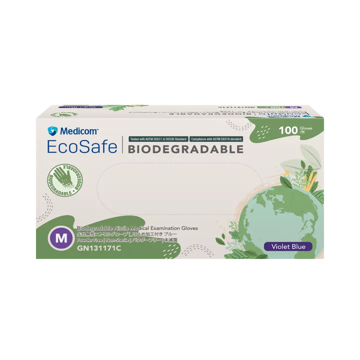 メディコム「エコセーフ」生分解性ニトリルグローブは環境への影響を考慮して開発された 生分解性のニトリルグローブです。 地球と共に生きることを選択した私達のひとつの答えがここにあります。 ●環境に配慮した生分解性  ASTM D5511高固体嫌気性消化条件下における生分解性試験において、  490日以内に約81%の生分解性能を示しました。 ●メディカルグレードの強度と伸張性  500%以上の伸張性を有しており、抗がん剤等の薬剤への耐性も高く、  EN455メディカルグレードに適合しております。 ●高い安全性(USフードグレード、天然ゴムラテックスフリー)  原料に天然ゴムを含まないため天然ゴムラテックスアレルギーの心配がございません。  また、HACCP対応、厳しい基準の米国の食品規格にも適合しています。(US FDA21 CFR177.2600) ・全長:230mm以上 ・掌部厚み:0.08mm以上 ・指先厚み:0.05mm以上 ・カラー:ブルー ・製造:マレーシア ●入数 ・100枚/箱 ・10箱/ケース ラテックスフリー パウダーフリー 左右兼用 内側塩素処理加工 滑り止め 生分解性 未滅菌
