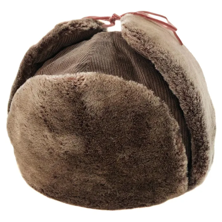 落ち着いたトーンのコーデュロイ地。光沢感のある短めのファーを使用。すっぽりかぶれる大きめサイズ。