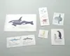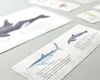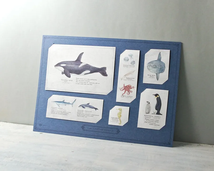 植物や動物などをモチーフにした図鑑の雰囲気を楽しめるカードセットです。 台紙ごとそのままかざってインテリアにもおすすめ。 デスクの上を飾ったり、押しピンや画鋲などで壁を飾ったり、眺めて楽しめます。 ポストカード1枚とメッセージカード5枚が台紙にセットされていて、カード部分は取り外して使用できます。 カードには学名科目などを添えて、シックな図鑑のような雰囲気のデザインに仕上げています。 裏面も飾り罫や罫線などが入っておりシンプルなデザインです。 台紙には自然の温もりとやさしさを感じさせる素朴な味わいが魅力の特殊紙を使用していますので カードのデザインに合わせて質感も楽しめます。 ◆バリエーションは下記の4種類ございます 《No.1》 ◇ポストカード:  ラズベリー 10cm×14.8cm ◇メッセージカード:  イチジク 5.5cm×10cm  シマリス 5cm×5cm  ハリネズミ 5cm×4cm  ドクベニタケ、ベニヒガサ、タマゴタケ 4cm×10.8cm  カラマツ、コナラ 10.8cm×5.2cm 《No.2》 ◇ポストカード:  コマクサ 10cm×14.8cm ◇メッセージカード:  キキョウ 5.5cm×10.5cm  フデリンドウ 5cm×5cm  キクイタダキ 5cm×4cm  ウサギギク、チシマギキョウ、ハクサンコザクラ 8cm×6.5cm  シマエナガ 7.2m×3.7cm 《No.3》 ◇ポストカード:  アカギツネ、ニホンカモシカ 10cm×14.8cm ◇メッセージカード:  ツユクサ 5cm×4cm  ニホンアナグマ 8cm×6.5cm  レンゲソウ、タンポポ 7.2cm×3.7cm  ヤマネ 5cm×5cm  ヤマガラ、シジュウカラ、ルリビタキ 5.5m×10.5cm 《No.4》 ◇ポストカード:  グラントシマウマ 10cm×14.8cm ◇メッセージカード:  キリン 5.5cm×10cm  ライオン 5cm×5cm  アフリカゾウ 5cm×4cm  ヨーロッパフラミンゴ 4cm×10.8cm  チーター 10.8cm×5.2cm 《No.5》 ◇ポストカード:  シャチ 10cm×14.8cm ◇メッセージカード:  ヨシキリザメ、ハンドウイルカ 12.2cm×5cm  ミズクラゲ、ヤリイカ、マダコ 4cm×10.8cm  タツノオトシゴ 4cm×4cm  マンボウ 5cm×7cm  コウテイペンギン 5.5cm×8cm 《内容量》ポストカード1枚、メッセージカード5枚 - - - Retronome〔レトロノーム〕シリーズ - - - 花や植物、生き物たちのありのままの姿をデフォルメせずに優しいタッチで丁寧に描き、図鑑風のデザインに仕上げたシリーズです。 ちょっとしたプレゼントやお土産に、男女問わず幅広い年齢の方にも興味を持っていただいています。 - - - - - - - - - - - - - - - - - - - - - - - - - - - - - - - - - - - - -