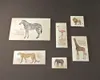 植物や動物などをモチーフにした図鑑の雰囲気を楽しめるカードセットです。 台紙ごとそのままかざってインテリアにもおすすめ。 デスクの上を飾ったり、押しピンや画鋲などで壁を飾ったり、眺めて楽しめます。 ポストカード1枚とメッセージカード5枚が台紙にセットされていて、カード部分は取り外して使用できます。 カードには学名科目などを添えて、シックな図鑑のような雰囲気のデザインに仕上げています。 裏面も飾り罫や罫線などが入っておりシンプルなデザインです。 台紙には自然の温もりとやさしさを感じさせる素朴な味わいが魅力の特殊紙を使用していますので カードのデザインに合わせて質感も楽しめます。 ◆バリエーションは下記の4種類ございます 《No.1》 ◇ポストカード:  ラズベリー 10cm×14.8cm ◇メッセージカード:  イチジク 5.5cm×10cm  シマリス 5cm×5cm  ハリネズミ 5cm×4cm  ドクベニタケ、ベニヒガサ、タマゴタケ 4cm×10.8cm  カラマツ、コナラ 10.8cm×5.2cm 《No.2》 ◇ポストカード:  コマクサ 10cm×14.8cm ◇メッセージカード:  キキョウ 5.5cm×10.5cm  フデリンドウ 5cm×5cm  キクイタダキ 5cm×4cm  ウサギギク、チシマギキョウ、ハクサンコザクラ 8cm×6.5cm  シマエナガ 7.2m×3.7cm 《No.3》 ◇ポストカード:  アカギツネ、ニホンカモシカ 10cm×14.8cm ◇メッセージカード:  ツユクサ 5cm×4cm  ニホンアナグマ 8cm×6.5cm  レンゲソウ、タンポポ 7.2cm×3.7cm  ヤマネ 5cm×5cm  ヤマガラ、シジュウカラ、ルリビタキ 5.5m×10.5cm 《No.4》 ◇ポストカード:  グラントシマウマ 10cm×14.8cm ◇メッセージカード:  キリン 5.5cm×10cm  ライオン 5cm×5cm  アフリカゾウ 5cm×4cm  ヨーロッパフラミンゴ 4cm×10.8cm  チーター 10.8cm×5.2cm 《No.5》 ◇ポストカード:  シャチ 10cm×14.8cm ◇メッセージカード:  ヨシキリザメ、ハンドウイルカ 12.2cm×5cm  ミズクラゲ、ヤリイカ、マダコ 4cm×10.8cm  タツノオトシゴ 4cm×4cm  マンボウ 5cm×7cm  コウテイペンギン 5.5cm×8cm 《内容量》ポストカード1枚、メッセージカード5枚 - - - Retronome〔レトロノーム〕シリーズ - - - 花や植物、生き物たちのありのままの姿をデフォルメせずに優しいタッチで丁寧に描き、図鑑風のデザインに仕上げたシリーズです。 ちょっとしたプレゼントやお土産に、男女問わず幅広い年齢の方にも興味を持っていただいています。 - - - - - - - - - - - - - - - - - - - - - - - - - - - - - - - - - - - - -