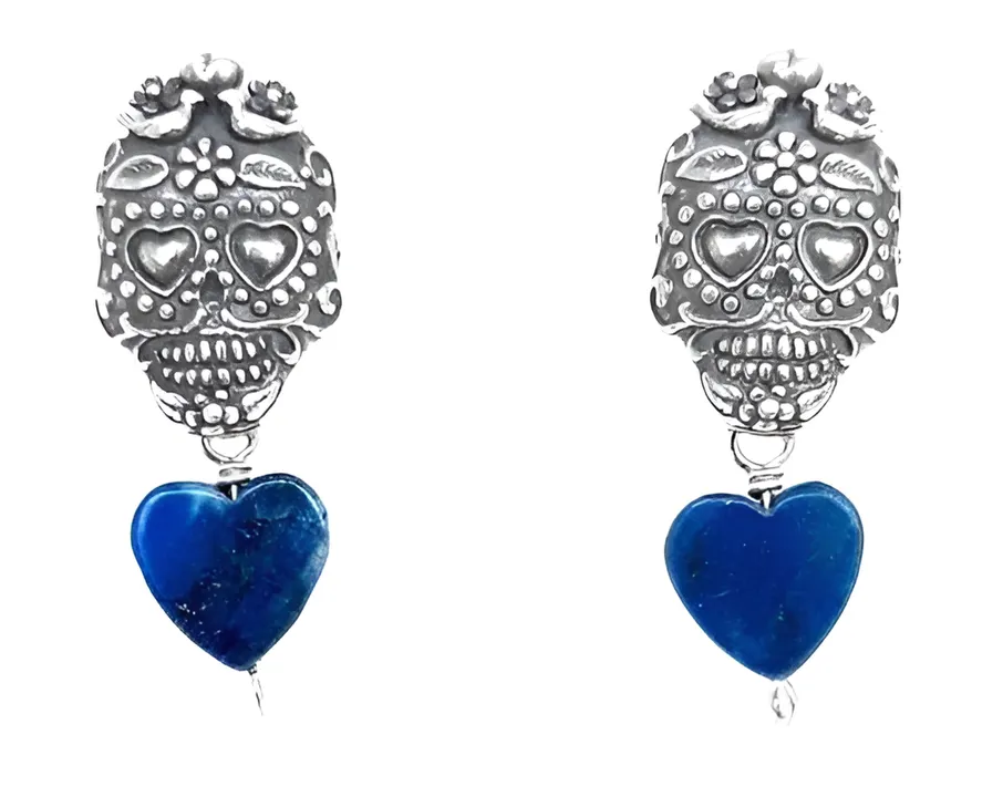 Aretes Calavera Ojos Corazón con Lapislázuli|スカルのピアス(シルバー・ラピスラズリ・天然石)