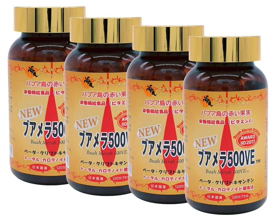 微量栄養素ベータ・クリプトキサンチンにとむ赤い果実ブアメラ(学名:Pandanus conoideus, 日本学名:なし、 提唱日本学名:アカイタコノキ) は、タコノキ科の稀少植物。 ブアメラはインドネシアのパプア島にだけに自然植生し、先住民は3万年にわたりブアメラを栄養機能性食品として摂取し、極悪の環境で生き延びてきています。 2000年に日本にノニを紹介した西垣敏明博士がノニに足りないカロテノイドを含む天然植物をインドネシアで探していました。 2005年、西垣博士はインドネシアのパプア島1500m高地でブアメラに遭遇し、直ちに長崎大学薬学部と共同研究を開始して、世界で初めて微量栄養素ベータ・クリプトキサンチンを発見。 赤い果実ブアメラのオイルを世界で初めてソフトカプセル化に成功しています。 2007年、国連の生物多様性条約に基づき、インドネシア政府と物質移転協定(MTA)を締結し日本への導入を完結した。 ブアメラオイルの製造の日本特許取得。 日本およびインドネシアの大学研究機関とブアメラの成分分析、安全性研究、ヒトでの吸収動態、肺がん・胃がん予防効果、閉経後骨粗しょう症の改善・予防効果、育毛効果、にきび改善治癒効果、美白(メラニン産生抑制)効果などの研究を行っている。 これらの研究の重要分野の成績については、学会報告、専門誌への投稿発表が行っている。 2017年、インドネシア政府から、オランダで開催されIID2017開発展で初めてインドネシア原産薬用植物の革新的栄養機能性食品として認定された(IID2017)。 2018年、国際化学会の招聘によりインドネシア化学会でブアメラのプロフィールの招待講演を行い、ブアメラの健康への重要性を広く啓蒙した。 ベータ・クリプトキサンチンはカロテノイド系の必須微量栄養素であり、その欠乏は日本人の様々な健康上の問題となっています。 ベータ・クリプトキサンチン、母乳を介して赤ちゃんの栄養補給、愛煙家、美容、加齢性変化などの予防や改善に有益な無添加の天然健康食品です。 ブアメラ500VEはソフトカプセル120粒、1粒500㎎を含み、1日4カプセルを目安に水などと一緒に摂取することにより、血中ベータ・クリプトキサンチン濃度を維持できると考えている。 総カロテノイド含量は6㎎以上、ビタミンEは16.4mg。 天然由来のビタミンEは、1日あたりの摂取量に含まれる当該栄養線分の量が栄養素等表示基準値に占める割合は260%として、栄養機能食品として標榜している。