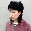 ニット素材のフライトキャップ。もこもこ感のあるプードルファーの耳あて。フライトキャップではあまり見慣れない綾織のテープを使用。耳当てを下ろすと冬の冷たい空気をシャットアウトしてくれます。