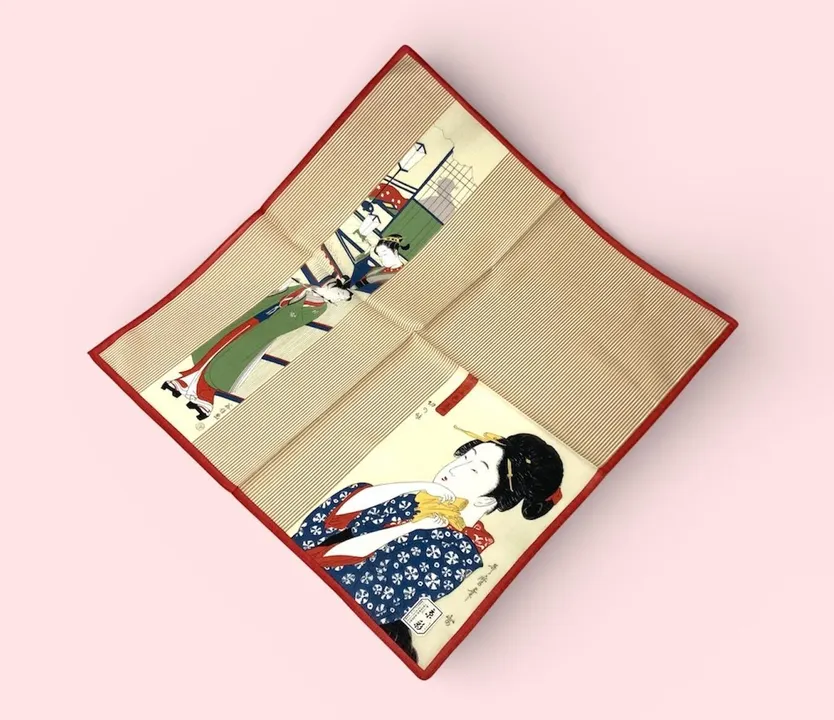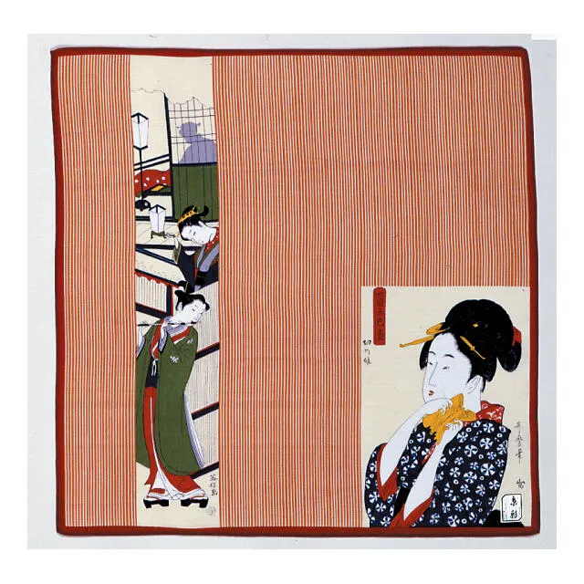 京彩 ハンカチ 浮世絵・寺社の襖絵や屏風絵に由来した意匠をもとに、捺染プリントで一枚一枚丁寧にプリントし、縫製されたハンカチです。絵画のように描いた、日本の伝統美を表現した美しい一枚です。 喜多川歌麿は江戸時代後期を代表する浮世絵師で、美人画の革新者です。 「美人大首絵」という女性の上半身を大きく描く構図を用い、顔の表情や仕草を通して内面の感情までも繊細に表現しました。 背景を省き、色彩や質感の美しさを際立たせる技法も駆使し、今もなお日本美術史に輝く天才絵師と評価されています。 生地の色はお使いのパソコンモニター・メーカーや機種の画面設定により、実際の商品の色とは異なってみえる場合がございます。予めご了承ください。 ご注文のタイミングによっては、注文確定後でも完売となる場合がございます。