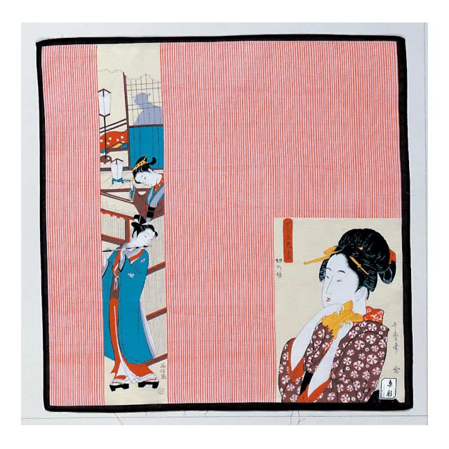 京彩 ハンカチ 浮世絵・寺社の襖絵や屏風絵に由来した意匠をもとに、捺染プリントで一枚一枚丁寧にプリントし、縫製されたハンカチです。絵画のように描いた、日本の伝統美を表現した美しい一枚です。 喜多川歌麿は江戸時代後期を代表する浮世絵師で、美人画の革新者です。 「美人大首絵」という女性の上半身を大きく描く構図を用い、顔の表情や仕草を通して内面の感情までも繊細に表現しました。 背景を省き、色彩や質感の美しさを際立たせる技法も駆使し、今もなお日本美術史に輝く天才絵師と評価されています。 サイズ・容量 約 43 × 43 cm 規格 綿 100%(ローン生地) 特記事項 生地の色はお使いのパソコンモニター・メーカーや機種の画面設定により、実際の商品の色とは異なってみえる場合がございます。予めご了承ください。 ご注文のタイミングによっては、注文確定後でも完売となる場合がございます。 生産国 日本