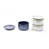 10cmプレートが乗ると蓋物として、そのまま冷蔵庫に収納できるスタッキングボウルとして開発されたボウルは、一人用のサラダなどにちょうど良いサイズになっています。 blur(ブラー) blur(ブラー)は、岐阜県の美濃焼きで昔からつくられている「黄瀬戸」という焼き物の技術に端を発しています。浸透性のある金属色素を本焼きする前の素焼きへ色づけする胆礬(たんぱん)という技法があります。 これを応用して、にじむような柔らかい色合いの器をつくることができないかと、まるで織物を染めるような発想からblurの製作がスタートしました。 従来の胆礬は金属色素に銅を使い、にじんだ緑色が特徴であるのに対し、blurではホワイトは塩化ニッケル、ブルーとブラウンは塩化コバルトを使用して、にじみの色合いを表現。凹凸部分の着色は最もこだわった箇所でもあり、筆でムラなく仕上げる職人の技術が生かされています。 こうしてできあがった器は、デイリーに使いたくなるアイテムになっています。