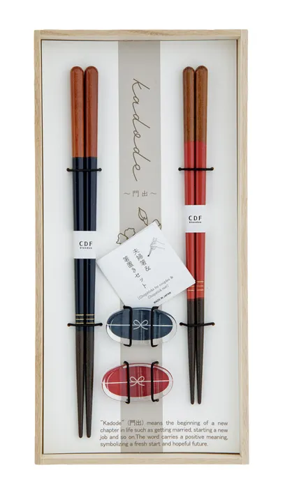 同シリーズの夫婦茶碗セットと柄を合わせた桐箱入りギフト箸セット。 お箸は“鉄扇子”という固くて強い木地を使用しています。 さりげない金ラインが高級感あるアクセントに。 アクリル素材の箸置きには水引をあしらい、お手入れしやすく使いやすい形です。 おめでたい門出に相応しい、日本のクラシックなデザインが贈り物に最適です。 夫婦茶碗セットをご一緒にどうぞ。