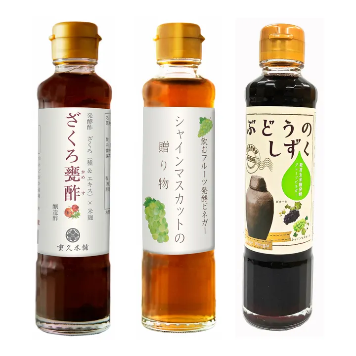 【ぶどうのしずく】 ・露天に並べられた甕壺(かめつぼ)の中にピオーネ、シャインマスカット、果汁を入れて1年以上発酵させた果実酢(ぶどう酢)を配合 ・米麹で発酵させることでアミノ酸も含むぶどう酢に。 ・甘味は身体のことを考えてオリゴ糖と黒糖のみで上白糖や果糖ぶどう糖液糖などは不使用 ・お子様やお酢が得意でない方にもおいしく飲んでいただけるぶどうの香りがフワッとして幸せな気分を味わえるフルーツビネガー ・化学調味料、酵母エキス、酸味料、保存料無添加、ノンカフェインだから小さなお子様にも安心してお飲みいただけます ・お水や炭酸水で3~7倍程度に希釈してお飲み下さい。アイスやヨーグルトに入れていただくと美味しく召し上がっていただけます。お酒好きな方は、焼酎やビールなどに適量入れてお飲み下さい。 【シャインマスカットの贈り物】 ・露天に並べられた甕壺(かめつぼ)の中にシャインマスカット、果汁を入れて1年以上発酵させた本物の果実酢(ぶどう酢)を配合 ・米麹で発酵させることでアミノ酸も含むぶどう酢に。 ・甘味は身体のことを考えてオリゴ糖と粗糖のみで上白糖や果糖ぶどう糖液糖などは不使用 ・お子様やお酢が得意でない方にもおいしく飲んでいただけるシャインマスカット香りがフワッとして幸せな気分を味わえるフルーツビネガー ・化学調味料、酵母エキス、酸味料、保存料無添加、ノンカフェインだから小さなお子様にも安心してお飲みいただけます ・お水や炭酸水で3~7倍程度に希釈してお飲み下さい。アイスやヨーグルトに入れていただくと美味しく召し上がっていただけます。お酒好きな方は、焼酎やビールなどに適量入れてお飲み下さい。 【ざくろ甕酢】 ・一般的なざくろ酢は、果汁を発酵させるだけ→弊社の場合は、赤い宝石といわれる希少なザクロの種も果汁と一緒に1年以上発酵させて造られた自然発酵ざくろ酢 ・甘味不使用のため酸味を感じるのフルーツビネガー ・美容に良いといわれているエラグ酸3mg/100ml含有 ・アミノ酸含有量605mg/100mlで黒酢とほぼ同量、米酢の10倍以上含有 ※一般的なフルーツ酢は果汁だけで発酵させます→弊社の場合ざくろを米麹で発酵させるためアミノ酸を含んでいます ・化学調味料、酵母エキス、保存料、香料、糖類無添加、ノンカフェインだから体にやさしい ・お水や炭酸水で5~7倍程度に希釈してお飲み下さい。アイスやヨーグルトに入れていただくと美味しく召し上がっていただけます。お酒好きな方は、焼酎やビールなどに適量入れてお飲み下さい。オススメは、サラダに、ドレッシングとしてオリーブオイル、塩と一緒にドレッシングとしてかけてお召し上がりください。
