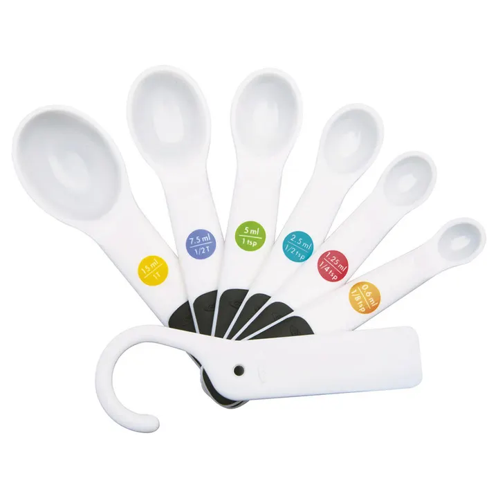 注意書き:食器洗乾燥機使用可、漂白可 セット内容:大さじ1、大さじ1/2、小さじ1、小さじ1/2、小さじ1/4、小さじ1/8、すり切りプレート 耐熱・耐冷温度:120℃ 仕様:食器洗浄乾燥機
