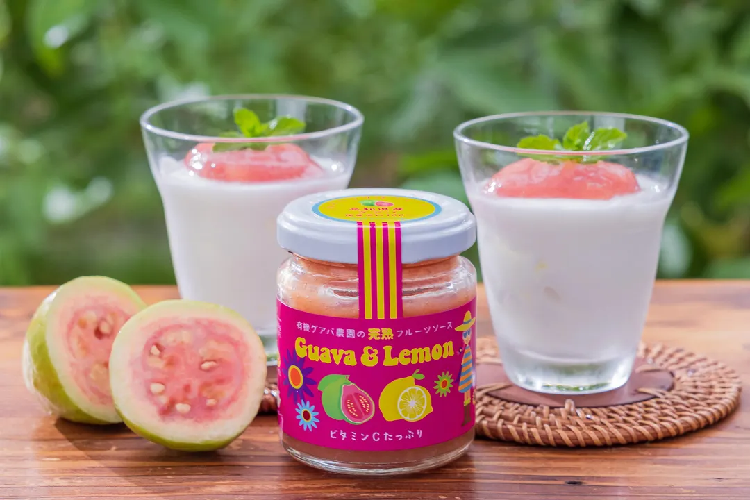オーガニックコスメブランドを持つ農園がフルーツソースを作ったらこうなりました♪ 有機グアバ農園の完熟フルーツソース【数量限定】 瓶サイズ:直径57mm高さ72mm 常温便でお届けします。 ベビーピンクのソースにビタミンCがたっぷり♪ビタミンCは、100gあたり51mg! 高知県南国市産の有機グアバ果実はレモンや柚子のおよそ7倍のビタミンCが含まれるミラクルフルーツです。 希少な有機グアバ果実に高知県四万十市産の自然栽培レモンのさわやかさをプラスし、 ビタミンCたっぷりの甘酸っぱいソースができました。 甘すぎないので、サラダのドレッシング、生ハム、ローストビーフ、パンケーキのソースとして、 彩も良く美味しく楽しくお好きなレシピをお楽しみいただけます。 厳選したシンプルな材料で作りました。 材料は有機グアバ果実(高知県南国市産)、自然栽培レモン(高知県四万十市産)、有機粗糖のみ。 国産原料100%‼人工甘味料、香料、保存料無添加 ピンク色は魅惑のフルーツ“グアバ”の天然色 日本ではあまり馴染みのない「グアバ」ですが、日照時間が日本でもトップクラスの高知県では1978年頃から品種改良されることなく大切に栽培されてきました。農園に一歩入るといい香りが漂ってきます。樹の上で完熟したグァバは芳醇な香りを持ち、果肉は鮮やかなピンク色です。