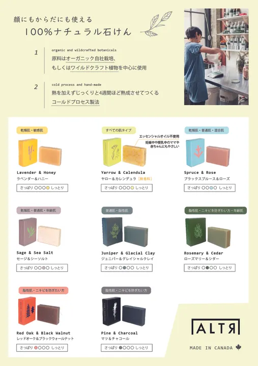カナダ発オーガニック&ワイルドクラフトな石けんブランド。100%ナチュラルな、顔にもからだにも使える石けんです。
