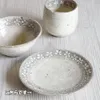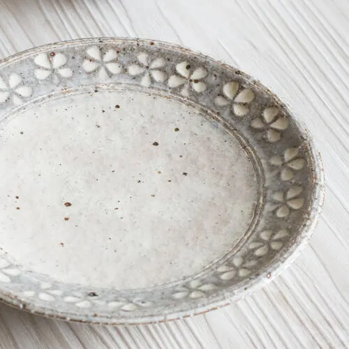 古くは室町時代より存在する、歴史ある三島柄。土鍋などでお馴染みの模様でもあります。三島柄の代表的な花模様が縁取りとして描かれています。