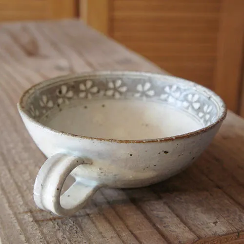 古くは室町時代より存在する、歴史ある三島柄。土鍋などでお馴染みの模様でもあります。三島柄の代表的な花模様が縁取りとして描かれています。