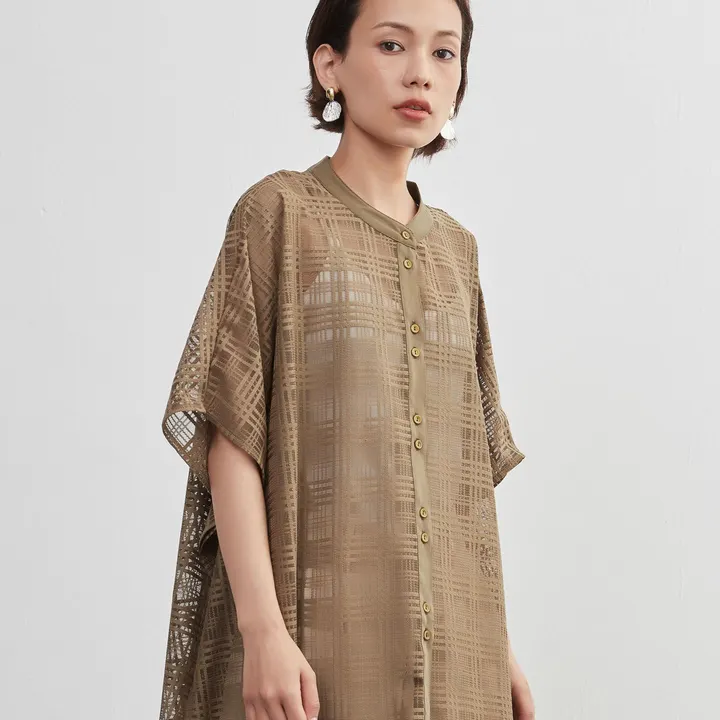 チェックレース・シアーブラウス・半袖オーバーシャツ・異素材ドッキングトップス 新しいシーズンのおしゃれを牽引する、チェックレースのシアー素材の美しい融合。半袖オーバーシャツと異素材前立てのドッキングが、今までにないエレガントなスタイルを生み出すトップスです。 特徴: チェックレースが華やかさを演出: フロントとバックに施されたチェックレースが、トップス全体に上品で華やかさを与えます。 シアー素材で軽やかな印象: シアーな素材が軽やかな風合いをもたらし、女性らしい柔らかな雰囲気を醸し出します。 異素材ドッキングが洗練感をプラス: 異素材のドッキングが、洗練された印象を与え、トレンド感あるスタイリングを実現。 スタイリングアイデア: デニムスカートと合わせてカジュアルに: チェックレースのエレガンスとデニムスカートのカジュアルさが絶妙にマッチ。デイリーカジュアルスタイルにぴったりです。 ワイドパンツでリゾート風スタイル: ワイドパンツと組み合わせて、リゾート風のリラックス感あるスタイリッシュなルックを演出。 このチェックレース・シアーブラウス・半袖オーバーシャツ・異素材ドッキングトップスは、今季のおしゃれにおいてトレンドをリードする一着。自信を持ってスタイリングを楽しんでください。 #レース#チェック#ドルマン#ブラウス#シアー#トップる#春夏#レイヤード#コーディネート#ボタン#フリーサイズ#FREE#体系カバー#定番#重ね着#ドッキング#リゾート#半袖#オーバーシャツ#シャツ