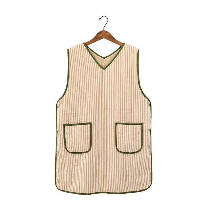 ボア付きのあったかエプロン 寒い日の家事に、ボア付きがうれしいエプロンです。 一見シンプルに見えますが、柄のかすれ具合やズレなど、手作業ならではの味わいがあたたかみを感じられるブロックプリントでプリントされたこだわりのストライプ柄。 便利なポケット付き。 脇にもスナップボタンがついているので、脱ぎ着もラクラク。 贈り物にもぴったりなアイテムです。 「ブロックプリント」は木版を使って、職人がひと版ひと版、手でスタンプを押すように生地の上にプリントするインドの伝統的な技法です。 ※表示数量を超える在庫や、詳しい納期につきましてはメッセージよりお問い合わせください。