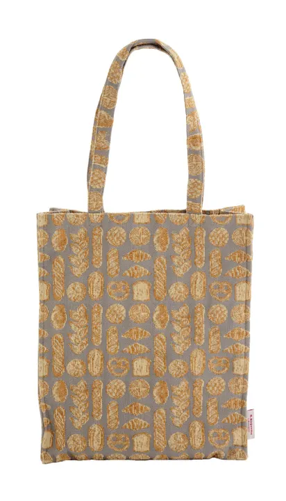 パン好きにはたまらない!!! 思わず手に取ってにっこり笑顔になってしまうような、パン三昧のジャガード織パン柄の縦トート。 パンの部分が起毛になっていて表情があり、肉厚感のあるしっかりとした生地感です。 パンが立体的に見えるように何度も何度も修正した甲斐あって、美味しそうなパン柄の織生地ができました! マチがしっかりあり、高さもございます。 内ポケットが2つあり上部は開放タイプでホックやファスナーはございません。 これを持ってパン屋さんに行けばテンションが上がること間違いなし! バゲットの頭をちょっとのぞかせて歩けば、注目を集めることも間違いなし! パン教室用のお稽古バッグとしても、おすすめです。