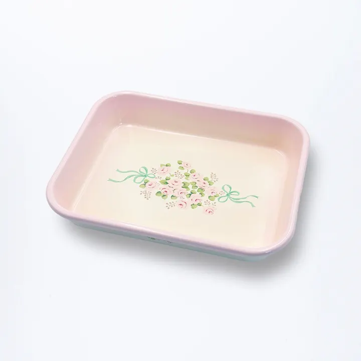 【imane premier】クリーム地にピンクの吹きが優しいバット。 下味や揚げ物の衣つけ、調味料や野菜を並べておく時に大活躍。専用の道具があるだけで普段のお料理も楽しくなります。 ホーロー製のためオーブンや直火にも対応しています。バットを使ってオーブンでできるちぎりパンやプリン、直接火にかられるのでグラタンやパイシチューは焼くところからバット1枚で行えます。 フタが付属しているため調理後に冷蔵庫で保存も◎。そのままテーブルに出せる可愛らしいデザインなので大皿料理やホームパーティーにもぴったり。 においの付きにくいホーロー製で清潔に。道具も、器もこれひとつ。 【ホーロー(琺瑯)の特徴】 金属とガラス、全く違う素材を結合させたホーローはそれぞれの良い面が生かされ、「ホーローならでは」の優れた特徴があります。 ・優れた耐久性、耐熱性、耐酸性 ・においが付きにくく抜群の非吸着性、清潔感 ・高い保温性で熱を逃さない ・美しい色合いと光沢が魅力 ■商品について イマンの商品はアンティークのような柄をほどこしている手作りの商品になります。 手作業で一つ一つ丁寧に柄つけておりますが、角度や位置等に若干の差がございます。 ■ホーロー製品 対応熱源:オーブン ※電子レンジ不可 ※加熱中や加熱直後は大変熱くなり火傷の危険がありますので、必ずミトンやふきん等のご使用をお願いします 【下記の場合は不良品ではありませんのでご注意ください】 ・ホーローの溶接部分や縁などに出る黒い部分は下地のホーローです。この部分はホーローがかかりにくいためこの様になります。 ・ホーローを焼く時に吊るすため、吊るしたあとが残る場合があります。 ・焼く際に細かな黒い点がつく場合やピンでつついたような小さな陥没がある場合もございますが、ご了承の程お願いいたします。 ・釉薬がかかりにくい部分は色ムラや凸凹、フタのズレ、素材や下釉薬が見られることがあります。 ・付属品の木ブタやポリプロピレンのフタは大量生産品につき細かな傷がある場合がございます。 ■手作りのため若干サイズが変わる場合があります。 ■撮影環境の関係上、実際の色と多少異なる場合があります。 ■販売商品以外のアイテムは付属しません。 ■他サイトにも掲載しています。在庫状況が変動する場合があります。 ■在庫数以上をご希望の場合は、お気軽にお問い合わせください。 ■商品は予告無く欠品・廃番となることがございます。ご了承ください。 ■イベント出展、夏季・冬季休業時は出荷予定日より長くかかってしまう場合がございます。  (お知らせにて掲載します。ご確認ください。)