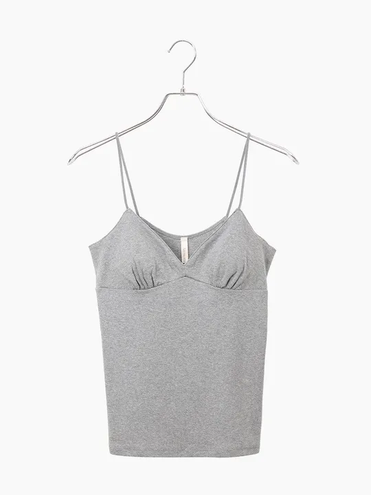 ボディラインを綺麗に見せるブラキャミソール。 華奢なストラップと、ほど良い深さのVネックがデコルテ回りを美しく見せてくれる一枚。 細く上品な印象の肩ストラップは、アジャスター付きで長さが調節可能。バストパッド付きで、パッドが不要な場合には、サイドのバストパッドポケットから取り外しができます。 ルームウェアやワンマイルウェアとしてはもちろんのこと、 アンダーバストにゴムを使用していないため、体の締め付けがなく、就寝時のインナーにもオススメです。 カラーは、低刺激反応染料で染めたグレーとナチュラルの糸を編みたてた「杢グレー」。 ・バストパット取り外し可能 ・肩紐にアジャスター付き