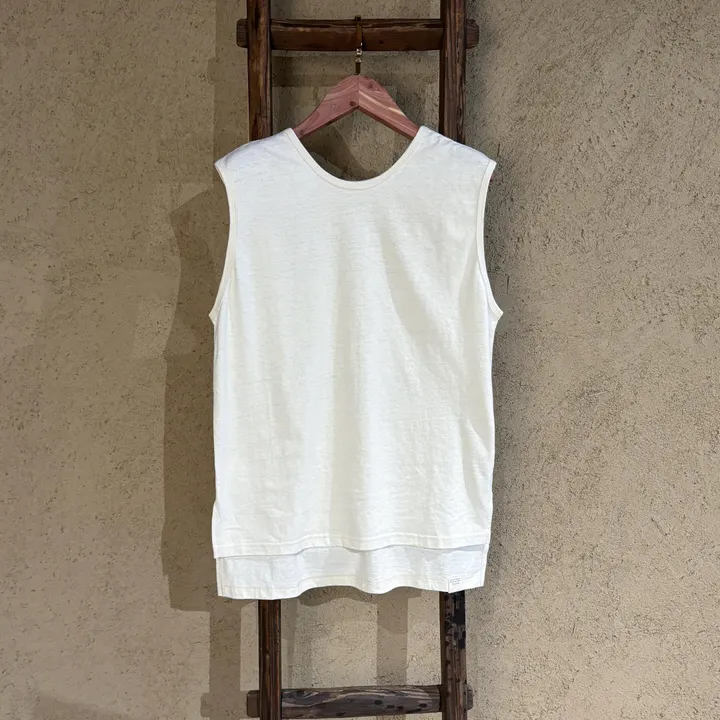 ヘンプ55%オーガニックコットン45%の ジャージ生地を用いたユニセックタンクトップ。 首周り、脇下、肩周りなどが無駄のないすっきりした形状で、 体型に応じて、品よく美しく着用いただけます。 男性の場合はタンクトップとして、 女性の場合はチュニックのようにもご使用いただけます。 両面表としてご使用いただけます。 表裏裾の長さを変えることで、動きやすくシャープなデザイン前後異なるデザインにしております。 ヨガなどのボディワークや季節を問わずインナーとして。 また1枚でも美しくすっきりご着用いただけます。 ヘンプ×コットンの混紡は通気性・保温性・調温性・調湿作用に優れ、コットンのやわらかい肌ざわりのよさとヘンプの丈夫な素材感をあわせ持つ、環境と身体にやさしい素材です。 ヘンプについて詳しくはこちらから ▷(https://www.hempfabric-organic.com/hemp) COLOR:white SIZE:1 着丈 48cm 身幅 37cm 袖口幅 17cm SIZE:2 着丈 51cm 身幅 39cm 袖口幅 17cm