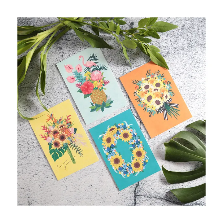 夏の植物をテーマに様々なシーンを描いたシリーズです。 元気になれそうな明るいひまわり、 トロピカルな植物、 懐かしい風景のようなアサガオ、 北欧の夏の森を散策… 裏面にはメッセージを書ける枠があるので、手渡しでも郵送でも贈りやすいデザインになっています。 カードサイズ:100×148mm オフセット印刷 定形で郵送可能 日本製