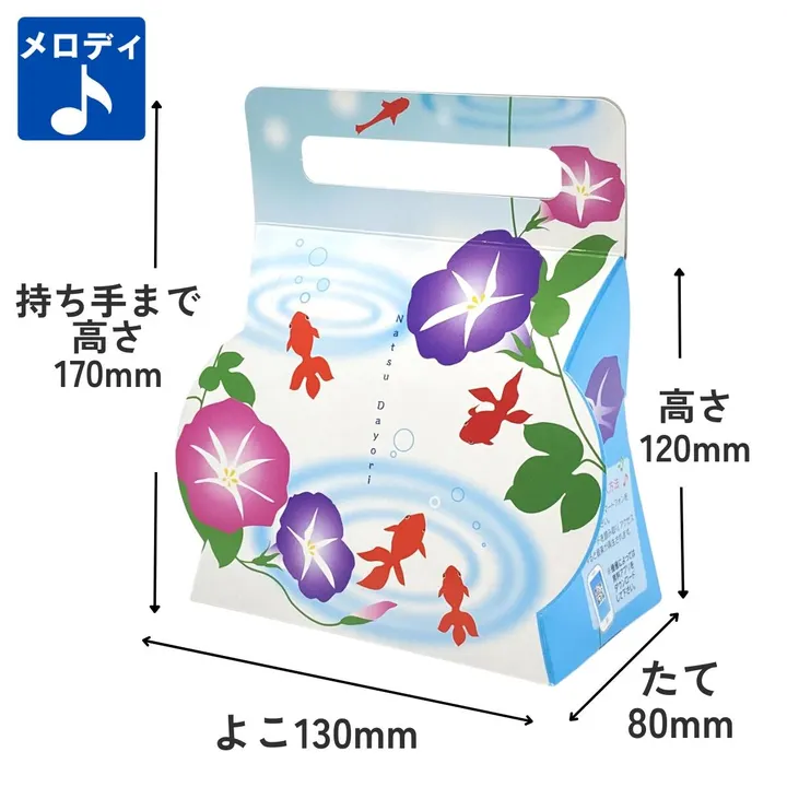 涼やかな金魚や朝顔、風鈴をあしらった夏らしいデザインのギフトボックスです。 和風のデザインですが、洋菓子にも和菓子にもお使いいただける 綺麗な色合いに仕上げました。 季節感を演出するパッケージは置くだけで季節のコーナー作りに、便利。 QRコードにスマホをかざせば夏の風情が感じられるメロディが流れます。 お客様のお手に取っていただきやすい 持ち手がついているキャリーBOX♪ 中身の商品は同じでも、 季節でパッケージが変わると、「新しい商品を置いている」と お客様に認識していただける使い勝手の良さも、人気の理由です☆ 低価格でラッピングいらずが嬉しい。 シールや包装紙、リボンのいらない便利なデザインボックスで人気商品です。 OPP袋なども特に必要ありません。 マドレーヌ(45×70ミリ見当)だと4〜5個程度が入る大きさです。 マドレーヌ・フィナンシェ・クッキーなど半生菓子や焼菓子、 おかき・あられ・キャンディー・ドライフルーツのギフトに。 靴下やハンカチ、ミニタオルなどアパレルや バスボム・バスソルトなど雑貨のギフトにも。 ティーバッグ・ドリップコーヒーなど個包装した商品にも。 平納品だから保管場所を取りません。 組み立ててお使い頂く紙製パッケージ。 お客様が商品をお召し上がり後、 廃棄されても再利用できる素材で製造しております。