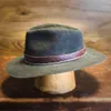 サイズM(57cm-59cm)、ブリム幅7cm サイズ調整リボン付き ウール 黒、グレー、ベージュ、緑などグラデーションMIX 牛革リボン <特徴その1> エイジング加工 帽体には陰影をつけた独自のエイジング加工を施してあります。 (汚れではありません。画像にてご確認の上ご購入ください) 黒、グレー、ベージュ、緑、さまざまな色合いがグラデーションになっていることで、 深みと奥行きがあります。 <特徴その2> 牛革ダメージドリボン、日本製リボン、金古美安全ピン付き。 革のリボンには独自のエイジング加工を施してあります。 (画像にてご確認の上ご購入ください) <この作品について職人から一言> 独自のエイジング加工を日々研究し、試行錯誤を繰り返し辿り着きました。 「大人」や「大人にかりかけの世代」にかぶって欲しい。 ふと出会ってきた「大人」たちを思い起こすと、 経験の多さやいろいろな面で素敵な空気を身につけている人がほとんど。 それをさらっとアピールするお手伝いを帽子がする。 そんな 「さりげなく目を引く」が作り出せたらと願って生まれた帽子です。
