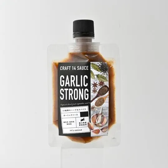 『クラフト14ソース ガーリックストロング』 香川県産の野菜、14種類のハーブとスパイスをふんだんに使い、香川県産の風味豊かなニンニクをオリジナルの10倍使用したニンニク風味のウスターソース。 化学調味料、着色料、保存料など不使用。 ひとつひとつ心を込めて手作りしています。 香川県産の新鮮な野菜の旨味とハーブとスパイスの豊かな香りが食欲をそそり、かけるだけでいつもの食卓がワンランクアップ! クラフト14ソース オリジナルをベースに、ニンニクのパンチを効かせた、ニンニク好きによる、ニンニク好きの為のクセになるガーリックソース。 ウスターソースと同じようにフライものや肉料理などにそのままかけてお召し上がりください。 ※原材料は季節、天候や仕入れ状況により、一時的に産地を変更する場合がございます。 【 おすすめ料理 】 ・ガツンと肉料理に。 ・熱を入れることでよりニンニクの風味が際立つので、BBQの主役級ソースに。 ・ジビエにも。 【 製品情報 】 名称:濃厚ソース 原材料名:香川県産サンマルツァーノトマト、香川県産たまねぎ、香川県産にんじん、香川県産セロリ、砂糖、ワインビネガー、食塩、しょうゆ(小麦、大豆を含む)、昆布、香辛料(香川県産にんにく、香川県産トウガラシ、香川県産ローリエ、ナツメグ、シナモン、クミン、クローブ、セージ、タイム、カルダモン、ブラックペッパー、オールスパイス、スターアニス、フェンネルシード) 内容量:100g 賞味期限:製造日より2年(開封後はお早めにお召し上がりください) 保存方法:直射日光および高温多湿を避けて常温で保存してください。開封後も常温可(温度が低くなると沈殿しやすくなります) ※安定剤や増粘剤を使っていないため、沈殿・分離などしますので、よく振ってお使いください。 ※内容物に材料の繊維、トマトの種などが残っていますが、品質に問題ありません。 ※注ぎ口に固まることがあります。固まったものを食べても問題ありません。 製造者:M's cocina 栄養成分表示(100gあたり) エネルギー 101kcal たんぱく質 1.8g 脂質 0.1g 炭水化物 23.3g 食塩相当量 3.3g