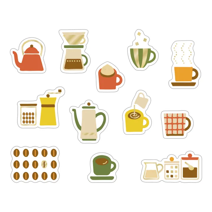 【 キラキラクリアシール With coffee 】 ★★キラキラマステのフレークシール版!  箔押しが魅力の「キラキラマステ」をクリアタイプのフレークシールとして 新たにシリーズ化した【キラキラクリアシール第2弾!】 『ゴールド箔』による、8柄展開★★ ゴールド箔がのったコーヒーモチーフのデザイン! コーヒーと背景のチェックが相まってとってもかわいい カフェスタイルの手帳に仕上げることができますよ♪ また、ノートやカレンダーの端に貼ったり、 ファイルケースや瓶・クリアボトルなど、 いろんなものを可愛くデコレーションできちゃいます♪ PET素材ならではの【透明度×やわらかさ×粘着】が 紙素材へのデコレーションだけでなく 身の回りの小物デコレーションにも馴染みます♪