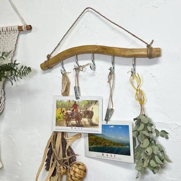 チークの根のハンガーフック付でございます シンプルで便利さに自信ありな商品です。 ナチュラルなハンガーだからこそ引き立つ可愛さです☆ 玄関にも活躍しますし寝室、リビングにはもちろん!!!フックは5個付いております サイズ:幅40cm 奥行3cm 高約25cm  材質・天然木 紐 最善の注意を払っておりますが、ナチュラル素材でハンドメイドの為、色合い、大きさ等、多少異なる場合がございますが、ご了承くださいませ。