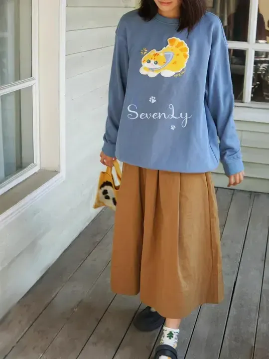 限定販売「2026新作」MEWJIオリジナル 猫ちゃん 猫モチーフ 刺繍スウェット 長袖 秋冬用 オーバサイズ ブルーM