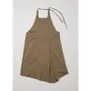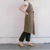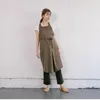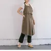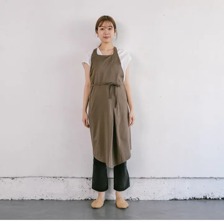 天竺カットソー(ニット素材)使いの。アシンメトリーフルエプロン。 どんなシーンにも合わせやすいトビブラウン。 カットソーでエプロンをお作りするのは、とても軽くてからだに馴染み 手触りも優しいからです。 一度着けるとこの良さを実感されることでしょう。 胸元は体に添うようカーブして、首紐に繋がるラインを細くしていることで、女性らしい雰囲気を出すとともに、胸元が浮かないので、着けていることを忘れるほどです。 アシンメトリーの裾が一番の特徴です。 左脇に大きめのタックを取り、タックに向かって斜めにカットした裾は、前身ごろは長めに取り、後ろは動いやすいように短めにしています。 裾のラインは、どこから見ても美しいシルエットを保っています。 タック部分が長いので、足長効果があります! ウエスト紐で結ぶタイプ。 よりファッション性を持たせるために、タックの上で紐を結ぶように、左右の紐の長さを変えています。 *首紐は肩が凝るという方のために、ウエスト裏にループを付けているので、結んでお使い頂けます。