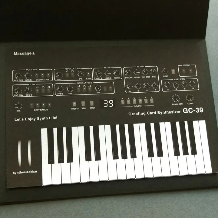シンセサイザーデザインのレターセット Greeting Card Synthesizer GC-39 です。 アナログシンセイザーをイメージしました。 商品名とセグメント液晶ナンバーに サンキューの意味も込め「39」にしています。 ギフトやメッセージカードにピッタリです。 厚めの紙を使用。 裏面はメッセージが書けるようになっています。 封筒はマットブラックのコットン封筒です。 シンセのハードケースの雰囲気を再現しシンセサイザー感を演出しています。 またカードはポストカードサイズで 便箋としてはもちろんポストカードとしても使えます。 <GC-39ブラック 商品内容> 封筒 1枚(洋2型) カード 2枚(ポストカードサイズ)