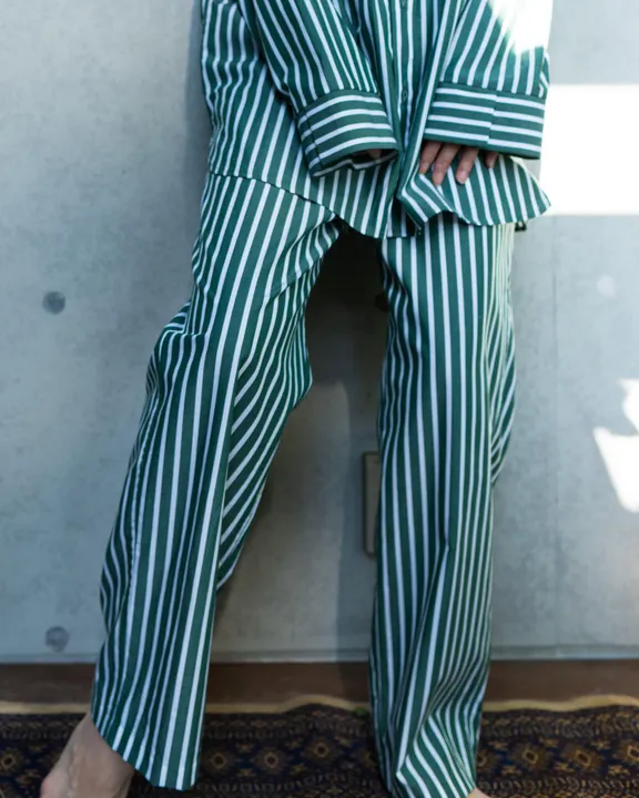 -DESIGN- ダボっとした絶妙なサイズ感。 少し緩めなゴムウエストがまたいい。 何よりラクで、気張らないながらも都会的。 さらりとした肌触り。 程よい艶とハリ感。 -MATERIAL- 独身男性や忙しい女性のため、形態安定加工済みの生地を使用。 洗濯したものに「アイロンがけ」をしなくてもある程度のシワは目立ちません。気になるシワがあれば、蒸気でシュッと。簡単に取れやすいというのが嬉しい。 お家で過ごす時間、もちろんそのまま街着として、そんな日常をボーダーレスに楽しむhis pants。 永く愛用した先はsleep wearとして、最後までお愉しみください。