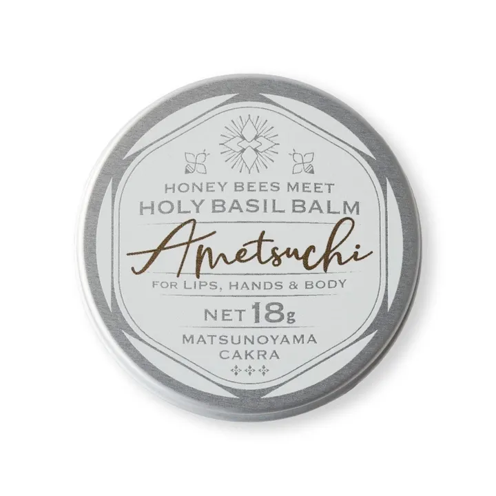 限定生産販売 日本ミツバチのミツロウを使った ホーリーバジルバーム「天地(あめつち)」 ※完売次第再生産予定 生産期間1か月以上。 ※使用している原材料の神目箒(ホーリーバジル)の精油が希少で限りがある為に大量生産できない事をご了承ください。 神目箒(ホーリーバジル)の花の最盛期にフレッシュで香り高い花穂の部分のみを摘み取って精油にし、 妻有地域の豊かな自然の中を飛び回る日本みつばちの蜜蝋と一緒になって唯一無二のバームが生まれました。 サラリとした使用感でリップや手指に神目箒の上品でほのかな香りとともに蜜蝋のうるおいを与えてくれます。 昇り始めた太陽に光る朝露、湿った土に根を張り生き生きと風に身を揺らすホーリーバジル、 どこからともなく現れて、心地よい羽音をたて花から花へと飛び始める蜜蜂…。 そんな夏の畑をぎゅっとそのまま詰め込んだようなバームです。 天から地へ地から天へ、いのち輪が廻る中で生かされていること、 天のめぐみ土のめぐみへの感謝を込めて。 ※全成分 : ホホバ種子油・マカデミア種子油・ミツロウ・カミメボウキ油・トコフェロール ※用途 : for LIPS, HANDS & BODY ※内容量 : 18g