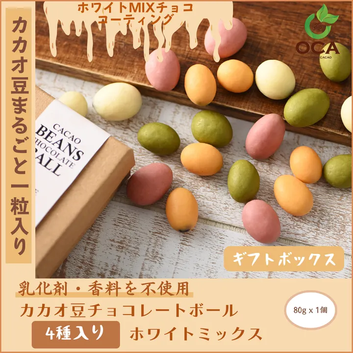 ・ナチュラルホワイトチョコ コーティングに使用しているホワイトチョコレートは、脱色、脱臭をしていない自然なままのカカオバター使用なので、ホワイトチョコからも、ほのかなカカオの香りが感じられます。 もちろん、このカカオバターもOCAの農園産。 なるべく余分なことをしないで、自然の風味を残したカカオバターからはカカオらしさが感じられます。 ・カカオバターを味わう カカオバターをたっぷり贅沢に使用しているので、口の中で少し溶かすようにして食べると、二つの食感と、カカオ豆の苦み、ホワイトチョコのミルキーな甘みの2種類の味が同時に口に広がります。 カカオバターの融点は体温より低く、33℃前後。そのため、口の中に入れると体温で自然と溶けることで口溶けの良さが生まれます。カカオの成分の約半分がカカオバターです。抗酸化成分が含まれているので、酸化しにくい性質を持ちます。ナチュラルに保存料要らずの優れもの。 ・カカオチップ伝統 カカオ豆を香りも良くコクのあるホワイトチョコレートでコーティングしました。口の中で甘さと苦味の融合を楽しめます。 ・カカオ豆ホワイトチョコレートボール抹茶 ホワイトチョコレートボールに抹茶の風味をプラスしました。おいしい苦味の中に抹茶の甘みが香ります。 ・カカオ豆ホワイトチョコレートボールビーツ カカオ豆を美容にうれしいビーツチョコレートでコーティングしました。見た目もきれいなチョコレートボールです。 ・カカオ豆ホワイトチョコレートボールガックフルーツ きれいな赤オレンジ色の熟したガックフルーツを使用。美容効果が期待できるスーバーフルーツで、マイルドな味はチョコレートとの相性も良く、他にないフレーバーです。