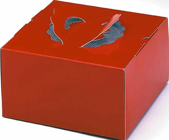 定番の赤無地デコ箱。キャリータイプです。 表面はツヤありの赤無地になっています。 4.5号、5号、6号の3サイズの展開です。 4.5号:内寸156×156×H105 ロット200 1つあたり75円  トレー付 5号 :内寸188×188×H115 ロット100 1つあたり84円  トレー無 6号 :内寸220×220×H115 ロット100 1つあたり100円  トレー無 ※この商品の5号・6号にはトレーは付いておりません。  4.5号にはレースペーパーを3本爪で留めた紙製トレーが付属しています。 ※4.5号の写真では、天面持ち手部分の窓に上質紙を貼ってありますが、  実物はPP貼りで中身が見えます。