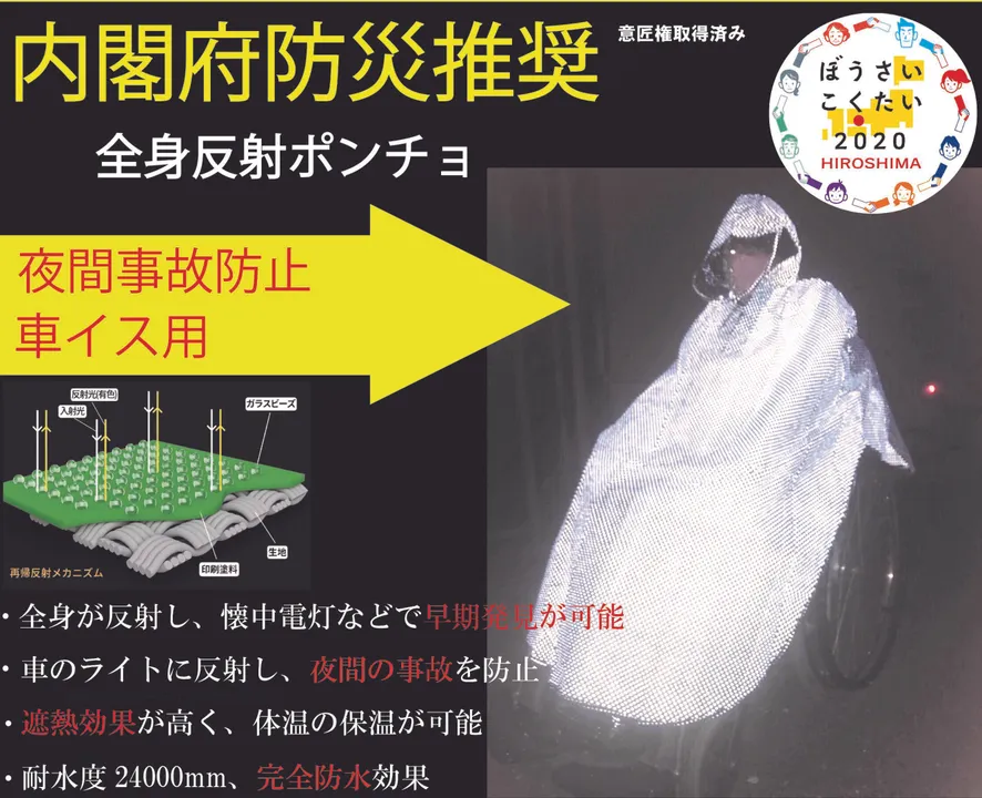 【内閣府防災推奨 災害時早期発見避難着】とは・・・ 当時の内閣特命大臣(防災担当)よりご依頼いただき、2020年度から内閣府主催 ぼうさいこくたいに3年連続出展。創業80年の傘の老舗メーカーにより、台風・豪雨など災害に巻き込まれたときに一分一秒でも早く発見され、救助されるために、と開発された商品です。防災避難着。 防災グッズ大賞2021 受賞。 【ずば抜けた視認性】生地全体にドット状の反射材をプリント。意匠権取得済み、㈱スギタだけが提供できる商品です。全身に反射材がついておりポンチョのどこに光が当たっても反射するので暗闇での視認性はばつぐん。また、遭難時に着用していた場合、体の一部でも懐中電灯の光があたれば反射するので、早期発見につながります。 夜の配達員さんの安全・雨の日や暗い時間帯の交通事故防止に。 【耐水圧】24000mm以上 ・・・JIS規格では耐水圧2000mm以上でレインウェアと認められます。傘生地で大雨に耐えられるとされる耐水圧は10000mm。レインウェアはすわるなどの動作、体重によってかかる圧力が変わります。大人の男性が濡れた場所に座るなどした場合、濡れないとされる耐水圧はおよそ10000mm。 アウトドア雨・雪対策で必要な耐水圧は10000mm、登山などは20000mm。耐水圧は十分です。 【遮熱】外気の寒さを20度近く遮断できる遮熱効果があり、熱が外に逃げないので避難時の寒さを防げます。天候の変わりやすい外出の装備品にもピッタリ。 たいせつなあの人の命を守る、いざという時の避難装備品 事前対策品として、 普段使いはレインコート、アウトドア(キャンプ・登山等)の装備品、夜のお散歩に、暗い夜道や視界が悪い雨の日でも、車・バイクのライトに反射するので相手からの視認性は抜群。交通事故防止にもつながります。