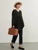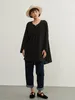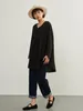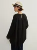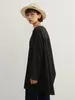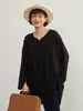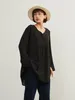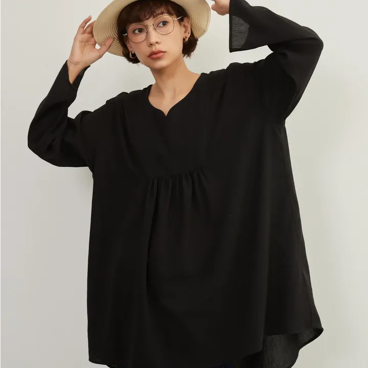 KNXT414-袖口スリット・長袖リネン混シャツ・ロングブラウス・体系カバーライトトップス FREE/BLACK