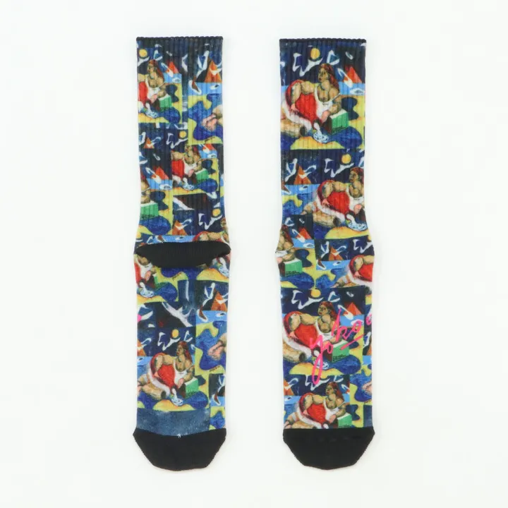 HOiSUMと日本を代表するアーティスト横尾忠則氏とのコラボレーションソックス。 連画の河 —— 終わりなきイメージの流れ 2023年春、横尾忠則氏は故郷の川辺で同級生たちと撮った一枚の古い記念写真をインスピレーションに、新たな連作「連画」に着手しました。 俳諧の「連歌」のように、昨日の筆跡が今日へ、今日の色彩が明日へとバトンを渡していく創作プロセス。 この作品世界では、イメージは川の流れのように現れては消え、過去作のモチーフも大河の中で溶け合います。この果てしない創造の旅は、世田谷美術館《連画の河》展(2025年4月25日開幕・新作油彩約60点展示)で体感できます。 HOiSUMは「連画の河」シリーズより、横尾忠則氏の芸術世界をソックスに落とし込みました。
