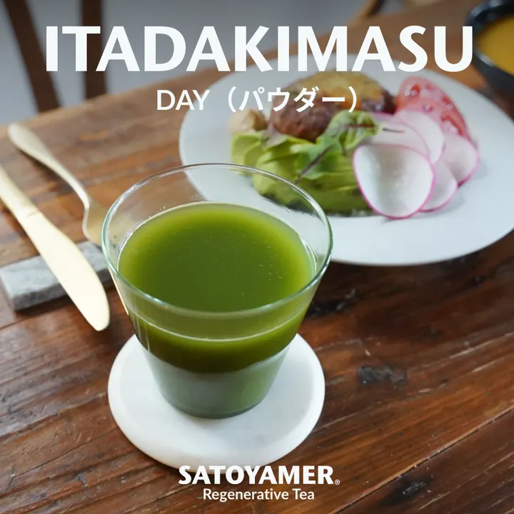 ■食前のめぐりを整える、SATOYAMER®の習慣茶 ITADAKIMASU DAYは、食事の前や日中の切り替えタイムに、心とからだのめぐりを整えるために設計された、SATOYAMER®の昼用ブレンドティーです。 スーパーフードとして再注目されている桑を中心に、五島列島のレモングラス、土づくりに定評のある八女茶をブレンド。食事と向き合う時間をつくり、日中の活動を心地よくサポートする一杯として、無理なく続けられる味わいに仕上げています。 パウダータイプは、素材をまるごと取り入れられるのが特長。お湯や水に溶かすだけで手軽に楽しめ、外出先や仕事の合間でも取り入れやすい仕様です。 パウダータイプは、素材をまるごと取り入れられるのが特長。お湯や水に溶かすだけで手軽に楽しめ、忙しい朝でも続けやすい仕様です。 ■味わいの特徴 桑のやさしい旨みをベースに、レモングラスの爽やかな香りが広がり、八女茶が全体をすっきりと引き締めます。 食事前にも飲みやすく、口の中をリセットするような軽やかさと、澄んだ後味が特長です。 ■パウダーと茶葉の違いについて SATOYAMER®のお茶は、ライフスタイルや飲用シーンに合わせて 「パウダー」と「茶葉」の2タイプをご用意しています。 原料やブレンド思想は同じですが、飲み方や体験の質に違いがあります。 ・パウダータイプの特徴 パウダータイプは、茶葉や植物を粉砕し、素材をまるごと取り入れられるのが特長です。 お湯や水に混ぜるだけで手軽に飲めるため、忙しい朝や外出時にも続けやすく、習慣化しやすい仕様です。 ボトル割りやミルク割り、スムージーなどアレンジもしやすく、日常の中に自然を取り入れるハードルを下げてくれます。 <こんな方におすすめ> 忙しくても手軽に続けたい/素材を余すことなく取り入れたい/アレンジも楽しみたい オフィスや外出先で飲みたい ・茶葉タイプの特徴 茶葉タイプは、茶葉や素材本来の香りや味わいの変化を楽しめるのが魅力です。 お湯を注ぎ、蒸らす時間そのものが、一息つく余白となり、五感で自然を感じる体験につながります。 一杯のお茶を丁寧に淹れることで、気持ちの切り替えやリラックスの時間を大切にしたい方に向いています。 <こんな方におすすめ> お茶を淹れる時間も楽しみたい/香りや余韻を重視したい ゆったりとした時間をつくりたい/来客時や特別な一杯として ■美味しい飲み方(基本) 使用量:パウダー1.5g お湯かお水:約500ml(お湯の温度:80℃前後がおすすめ) ボトルにいれ、よく振ってからお召し上がりください。 外出前の1分で手軽に、自然の恵みをそのまま味わえます。 時間を置くと、風味がゆるやかに変化していきます。 ※冷やすと、レモングラスの香りがいっそう華やかに感じられます。 ※暑い季節には、水出しにしても爽やかです。 ※水出しにすると、緑茶の渋みが抑えられ、まろやかな飲み心地に。 ■おすすめアレンジ ・濃いめのロック  少量のお湯で溶かし、氷をいれてロックで ・豆乳・オーツミルク割り  まろやかさが増し、朝食代わりにも。 ・寒天などのスイーツアレンジ   ■こんな方・シーンにおすすめ 食事前に、気持ちとからだを整えたい 日中の切り替えやリフレッシュに 外食や会食が多く、食事の時間を大切にしたい 自然を感じる習慣を、無理なく取り入れたい ■商品情報 名称:ブレンド茶(粉末) 原材料:桑、レモングラス、緑茶 内容量:※商品仕様に合わせて記載 保存方法:高温多湿・直射日光を避け、冷暗所で保存してください ご注意:開封後はお早めにお召し上がりください