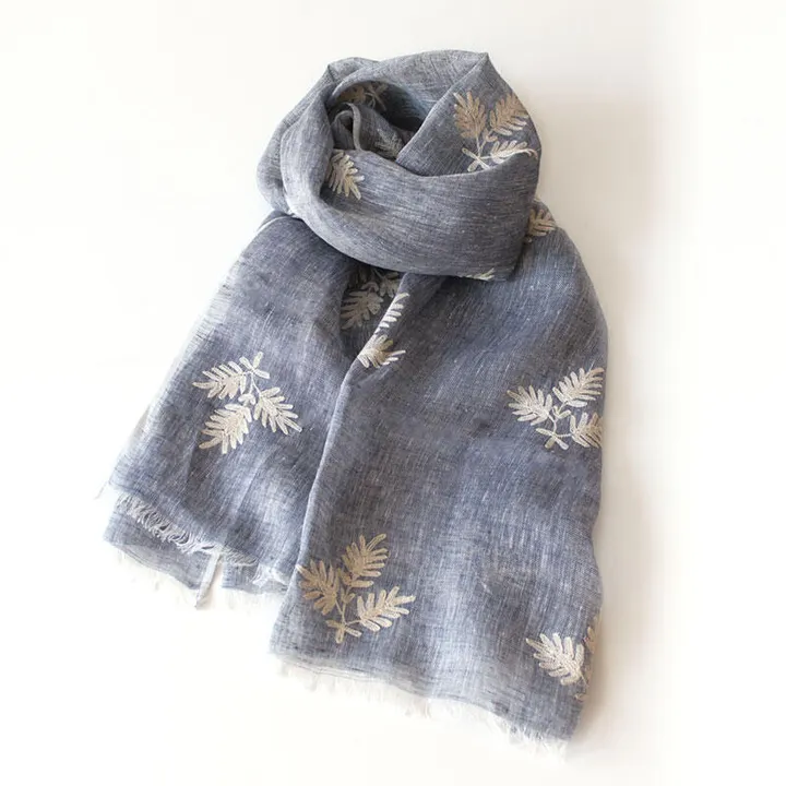 デリケートな首元にもチクチクすることがない上質リネンを使ったオリジナルのリネンストールです。上質で軽やかなリネンは、使い込むほどに柔らかく肌に馴染んでいきます。 ☑ コンセプト 「健康」「環境」「造り」をコンセプトにしたインテリアショップ自社開発のリネン製品 ☑ 天然素材100% 天然素材100%の高品質なアイテムを使いやすい価格で「リネン製品をもっと気軽に」 ☑ 低ホルムアルデヒド 定期的に国内でホルムアルデヒド検査を実施、お子さまからお年寄りまでからだにも環境にも安心 【オールシーズン使える上質リネン】 リネンって夏だけ?と思っている方はサラッとした肌触りながら、やさしい暖かさに驚かれると思います。 あたたかい素材のストールは気分じゃない・・・ 映画館や観劇で肌寒くなってしまう・・・ そんなときも、リネンストールなら重くなりすぎず、季節の変わり目にも重宝します。 もちろん、夏の室内での冷房対策や首元の日焼け防止にも。持ち歩くときは、バッグに結んでしまってもアクセントに。無造作にバッグにつっこんでもなぜかサマになります。 【デザイン】 無地のストールでは物足りない・・・シンプルでも華やかな1枚が欲しい。そんなご要望に応えるべく、厳選した生地糸を使い、ニュアンスカラーの洋服にもコーディネートしやすいデザインで。リーフの刺繍はサイズとバランスにこだわりました。 ■グレー ベースのベビーグレーは透け感のある雰囲気に。リーフの刺繍は爽やかに白で縫い合わせています。 ■ホワイト ベースのオフホワイトはアイボリーと組み合わせて織り、優しい雰囲気に。リーフの刺繍は同系色のホワイトで縫い合わせています。 ■パープル ベースのパープルはスモーキーな色味に透け感をくわえた雰囲気に。リーフの刺繍は馴染みのいいアイボリーを縫い合わせています。 ■ネイビー ベースにはネイビーとホワイトの糸を組み合わせニュアンスのあるカジュアルな雰囲気に。リーフの刺繍は爽やかにクリーム色で縫い合わせています。