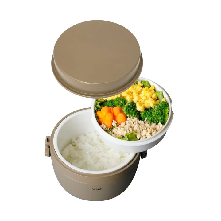 出先でも温かいご飯が食べられる。塾などの習い事のお弁当にも最適な「holms(ホルムス)ランチジャー」どんぶり型のランチジャーで、ご飯とおかずを保温しながら持ち運べます。ステンレス真空断熱2層構造なので、出先でも温かい食事を楽しめます。スタイリッシュなテイストが程よく、ファッションやインテリアに馴染みます。前日に盛り付けして、朝温めて持っていけば忙しい朝の時短にも。おかず容器とご飯容器は電子レンジも使えるので、温め直しや加熱が出来ます。※電子レンジをご使用の際は、おかず容器フタを外してください。