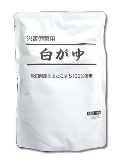 “災害備蓄用白がゆ”は、こまちがゆと同様“秋田県産あきたこまち”を原料として仕上げました。 “災害備蓄用白がゆ”は恵まれた秋田の自然に育まれたあきたこまちと、清冽な天然地下水だけで仕上げたとってもヘルシーな【保存料不使用】のおかゆです。 時間をかけて炊き上げた災害備蓄用白がゆは、消化も早くお子様からお年寄りまで安心しておいしくお召し上がりいただけます。 賞味期限5年間と長期保存も可能ですので、災害時の非常食としてご利用ください。