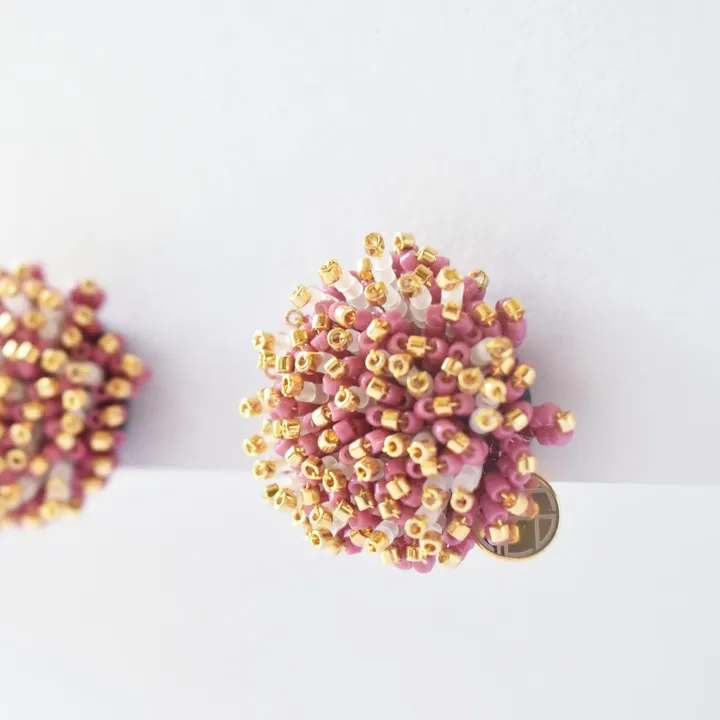 万葉の歌人 山上憶良が詠んだ秋の七草のひとつとして 知られるフジバカマ 小豆色の花に 粉糖をふりかけたように優雅に咲き誇ります 近頃は絶滅危惧種に指定されているそうですが 吸蜜のためにたくさんの蝶が藤袴へ群れ集い 乱舞する光景を この目で一度はみてみたいものです *こちらの商品は、お客さまの耳の形状やピアスホールの位置によっては、装着位置がご満足いただけない場合がございます。 material K14GF ゴールドフィルド(ピアス金具)、ガラスビーズ、金糸、真鍮、チタン、フェルト、本革、シリコン *ゴールドビーズは本金メッキ加工を施したものを使用しております *下地カラーはベージュに変更しております size 約Φ28x13mm weight 約5.0g *CACICOの商品は全て1点1点制作しているため、個体差があり、商品写真と差がある場合がございます。ご了承の上、ご購入ください。 *金属アレルギーの方はご使用をお控えください *受注生産のため、ご注文確定後1週間~10日以内に商品を発送いたします