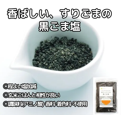 「黒ごま塩 100g」は玄米ごはんと相性の良いごま塩です。化学調味料や添加物を使用せず、シンプルに、黒ごまと塩をブレンドしました。黒胡麻の香ばしさと、程よい塩加減が特徴です。野菜と和えれば、簡単な胡麻和えとしてもお使いいただけます。