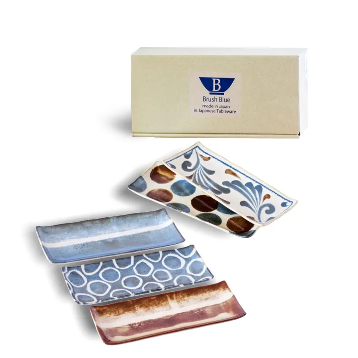 藍色と手描きの風合いを楽しむ器、ブラッシュブルー 製造工程において色の濃淡や釉薬の流れ、柄のにじみなど、それぞれが違う出方になるのも特徴です それが個性となり唯一無二のものに 手描きのような質感をお楽しみください 民芸スタイルの質感ある長角皿のセットです 渋めの長角皿はどんな料理も引き立ててくれます