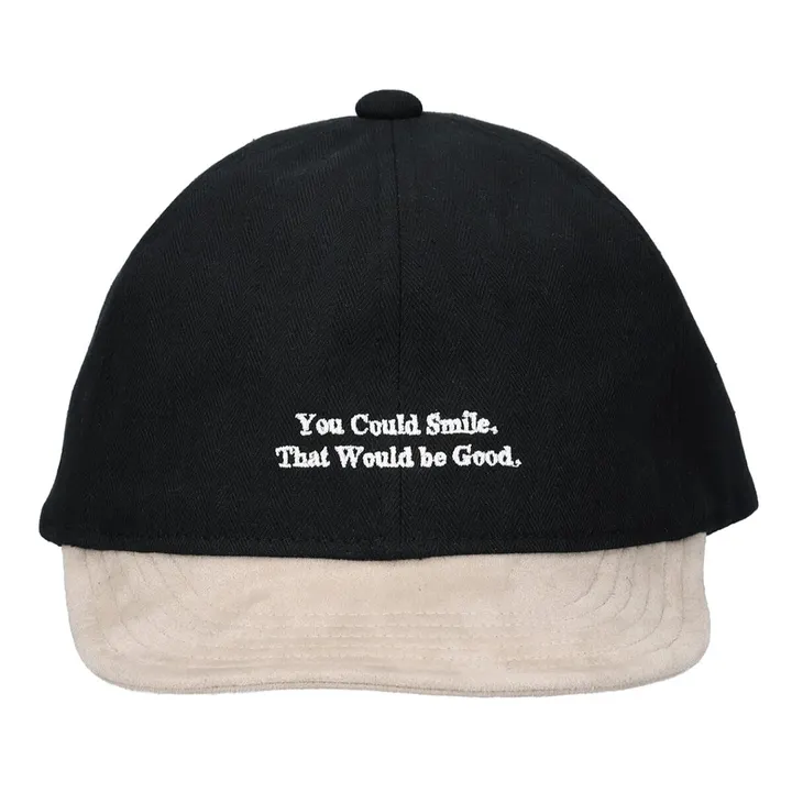 ヘリンボーン織コットンとフェイクスエードで切り替えたアンパイアキャップ。前立てには2段フレーズ刺繍。アジャスターはナイロンテープとブラックニッケル金具。