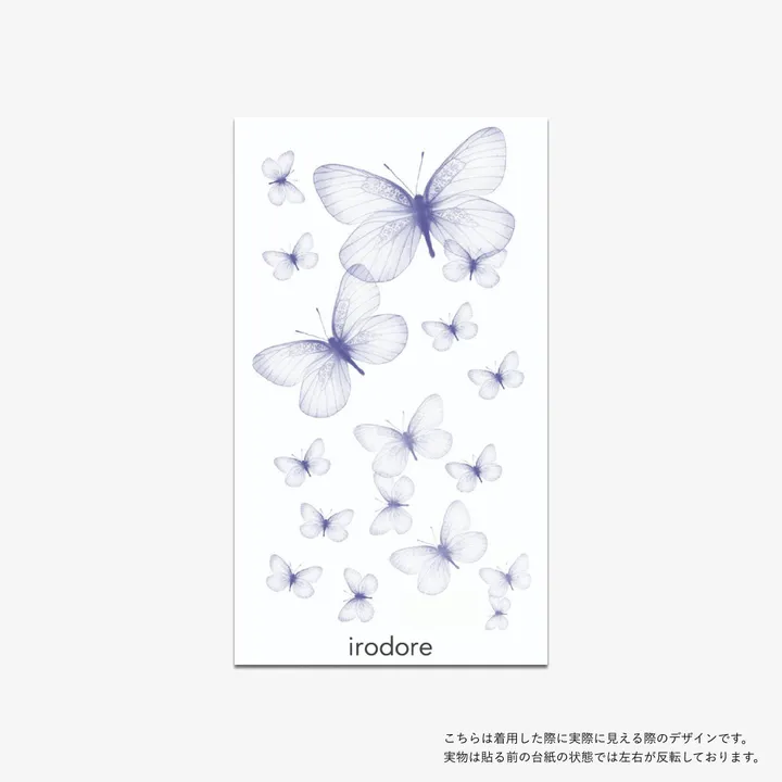 <タトゥーシールについて> ・水で転写するタイプのタトゥーシールです ・約3日間肌に綺麗な状態で保ちます ・裏面に貼り方の説明の記載があります <デザインついて> 青白い蝶々のデザインです。カラータトゥーですが肌馴染みがよく初めての方にも使いやすいです。 また大人っぽい透け感のあるテイストが幅広い年齢から人気です。 <貼り方について> 1. 貼りたいデザインを切り抜きます 2. フィルムを剥がします 3. 貼る場所を決めます(着用するとデザインは反転することに注意) 4. 台紙に水分を染み込ませます 5. 30秒ほど台紙を押さえます 6. ゆっくりを台紙をスライドさせて完成 <ブランドについて> irodoreは「肌に一番近いおまじない」をコンセプトにしたタトゥーシールブランドです。日常的に使えるナチュラルで可愛い、綺麗なデザインを多数展開しています。